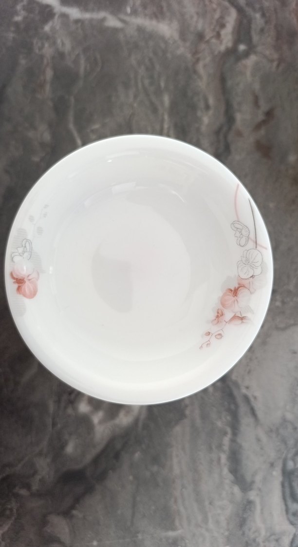 Beyaz çay tabağı, kenarlarında ince pembe çiçek desenleri bulunur, yemek servisi için uygundur. ️
