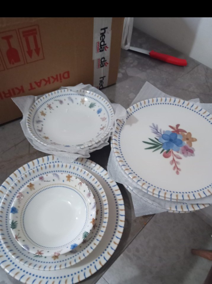 Çiçek desenli ve dekoratif çizgili beyaz seramik yemek tabakları seti.