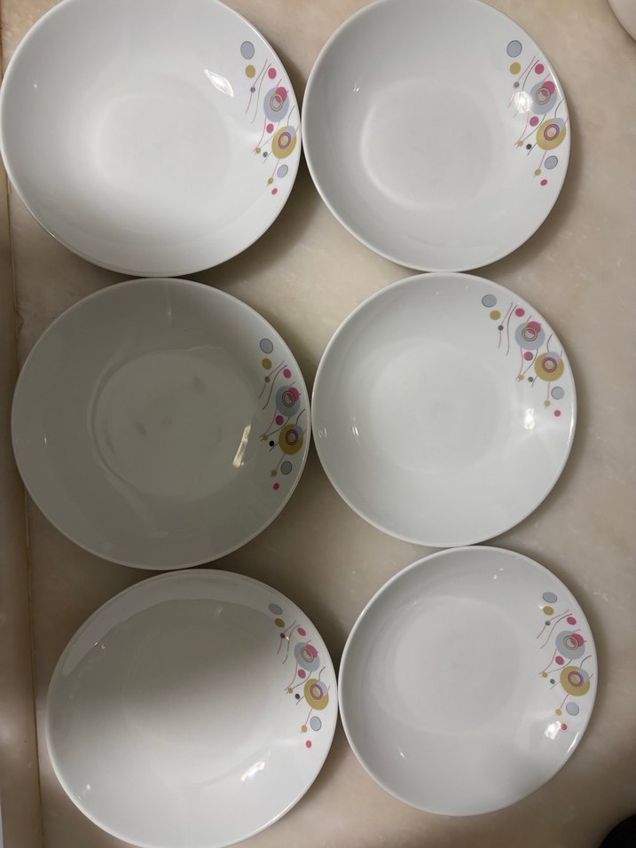 Altı adet beyaz yemek tabağı, kenarında zarif çiçek desenleri bulunan set. ️