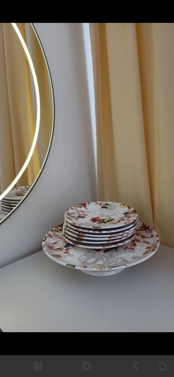Çiçek desenli beyaz yemek tabakları seti, küçük tabaklar büyük tabak üzerinde dizili. Hafif ve şık tasarım, yemek servisi için uygundur. ️