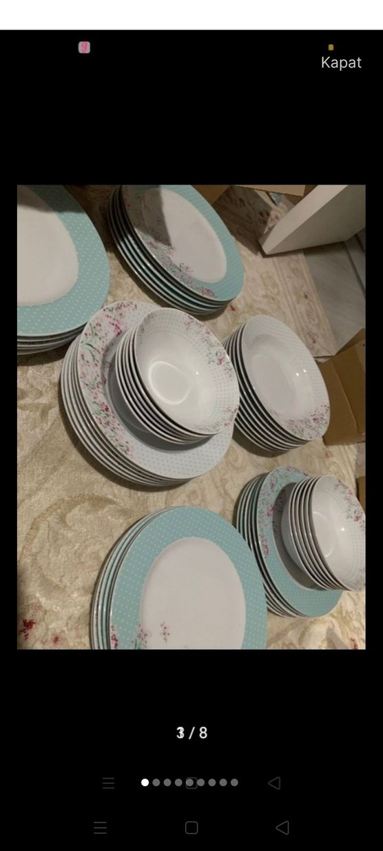 Çiçek desenli ve açık mavi detaylara sahip beyaz yemek takımıdır. Tabak ve kaselerden oluşur, şık sunum için uygundur. 6 kişilik yeni hiç kullanmadım ️