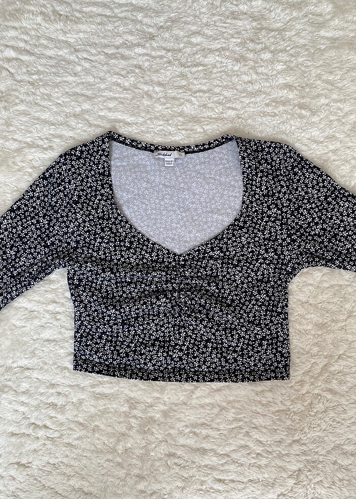 V yaka önü büzgülü çiçek desenli crop üst ve bandana seti. Temiz ürün pasajdan alındı