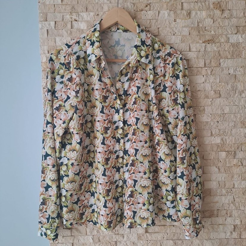 Bej renkte, çiçek desenli, uzun kollu, yakalı ve düğmeli bohem tarzda kadın gömleği. Rahat kesimli ve tekstil kumaştan yapılmıştır.