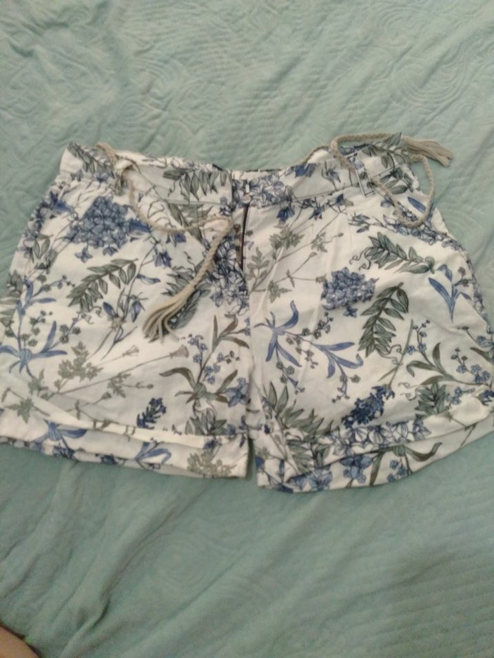 Yumuşak pamuklu kumaştan, düğmeli ve pastel çiçek desenli, bol kesim beyaz mini şort, dış mekan kullanımı için uygundur.