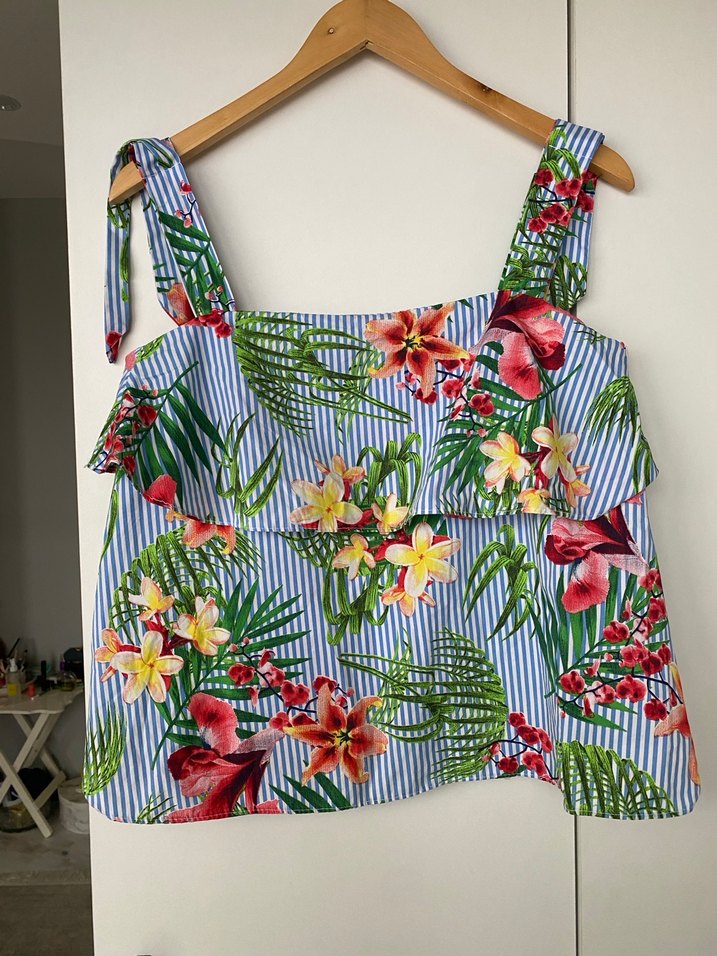 Çiçek desenli, askılı ve straplez yakalı, bol kesim mini bluz. Sentetik kumaştan, fırfır detaylı, bohem tarzına uygun renkli tasarım.