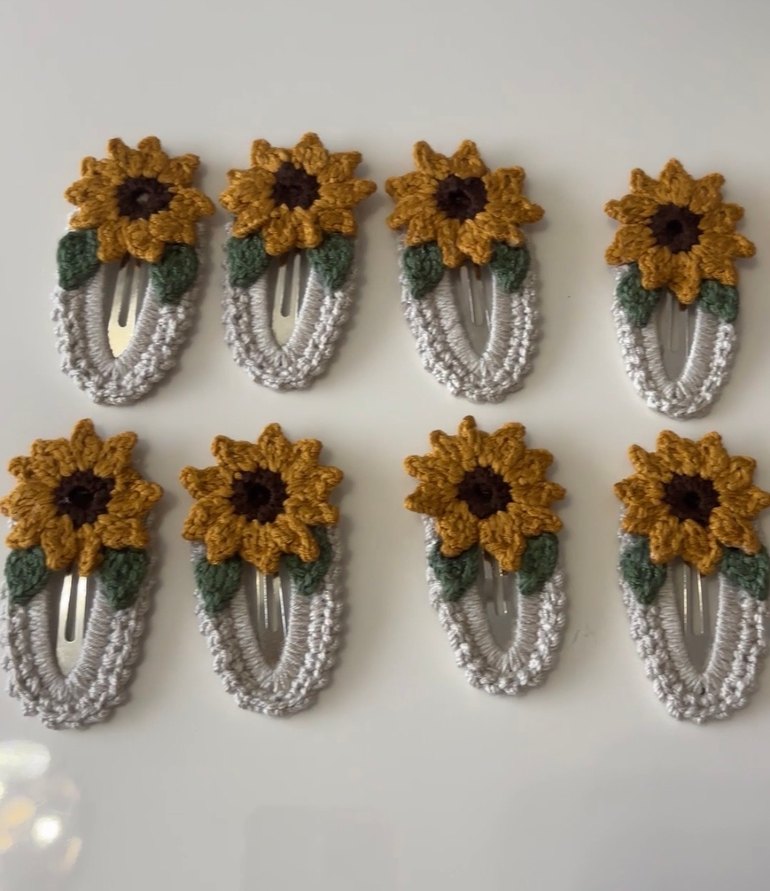 Çift fiyatı 80 tl çiçek desenli, gri detaylı örme ayçiçeği şeklinde bohem çocuk saç tokası