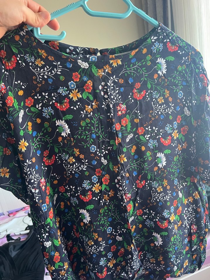 Yuvarlak yaka, kısa kollu, bol kesim ve normal boyda midi uzunluğunda bluzu. Koyu renkli çok renkli çiçek desenli ve düğmeli, bohem tarzda.
