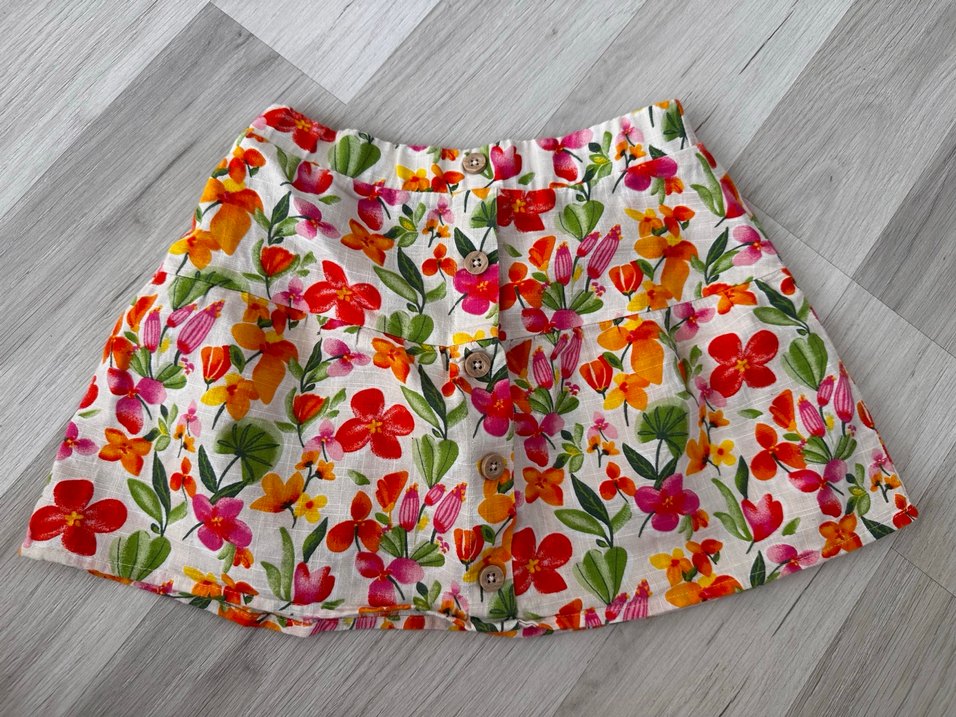 Renkli bohem tarzda, düğmeli önü ve bol kesimi ile çiçek desenli kız eteği. Hafif sentetik kumaştan üretilmiştir.