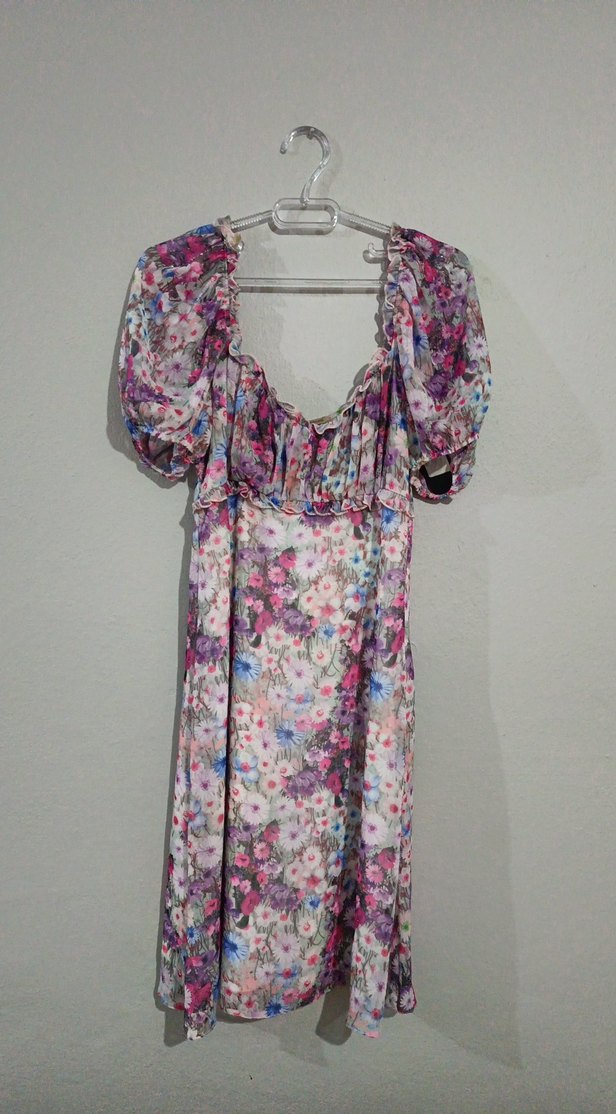 Şifon kumaştan,astarlı ve fırfır detaylı, tekne yakalı bohem elbise. Canlı pastel çiçek desenli, günlük kullanım için uygundur. Yakadan itibaren uzunluğu 75 cm.