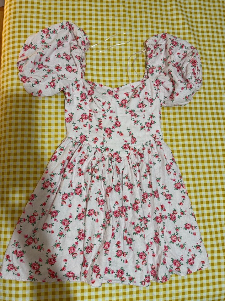 Kısa kabarık kollu, fırfırlı, bol kesim elbise. Yumuşak sentetik kumaştan, pastel çiçek desenli ve kayık yakalı.