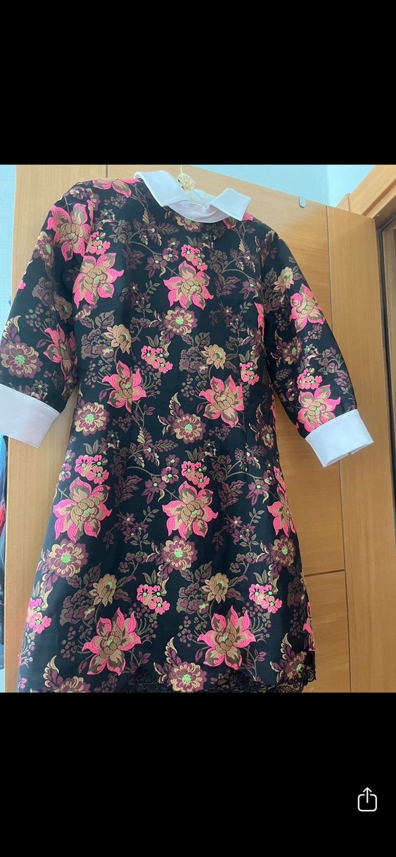 Bu bohem tarz elbisesi, yakalı ve düğmeli, uzun kollu, koyu renkli çok renkli çiçek desenlidir.