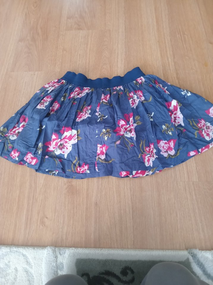 Bohem tarzda, çiçek desenli mavi-gri, bol kesim ve fırfırlı kız eteği. Yumuşak sentetik kumaştan üretilmiştir.