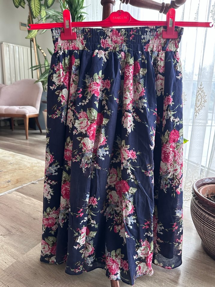 Koyu mavi, çiçek desenli, bol kesimli ve drapeli tasarıma sahip. Yumuşak sentetik kumaştan, bohem tarzını yansıtır. Boy: 74cm %100 pamuk