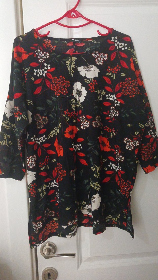 Drapeli, uzun kollu, V yakalı, çok renkli koyu çiçek desenli bol kesim hamile bluzu. Sentetik kumaştan, günlük kullanım için uygundur.