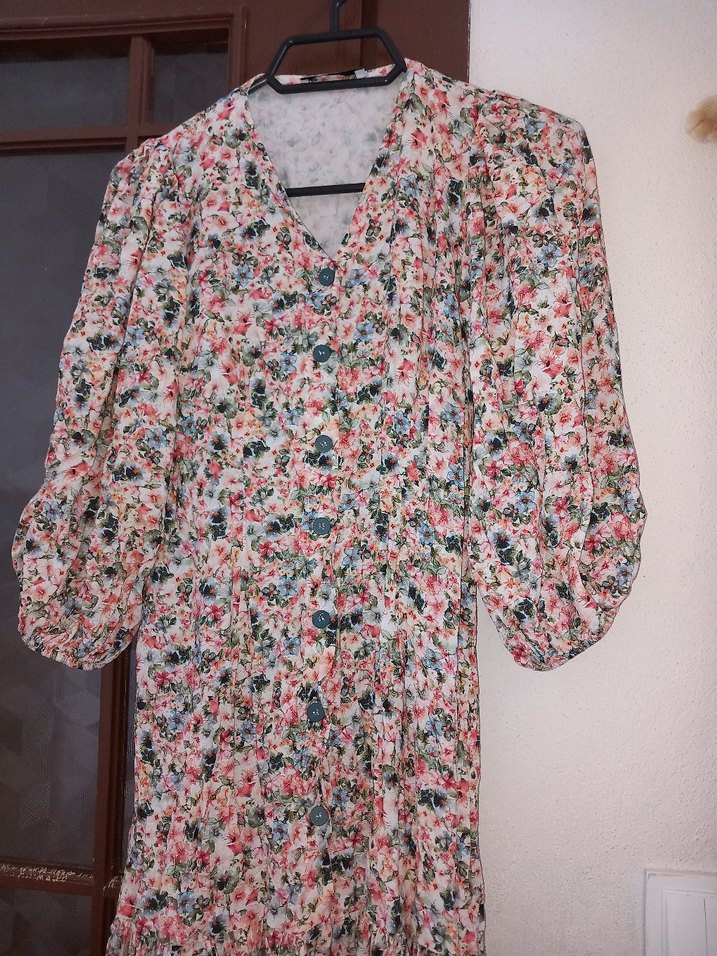 V yaka, uzun kollu, düğmeli, bol kesim hamile bluzu. Pastel renklerde çiçek desenli, yumuşak sentetik kumaştan yapılmıştır. Bohem tarzı için uygundur.