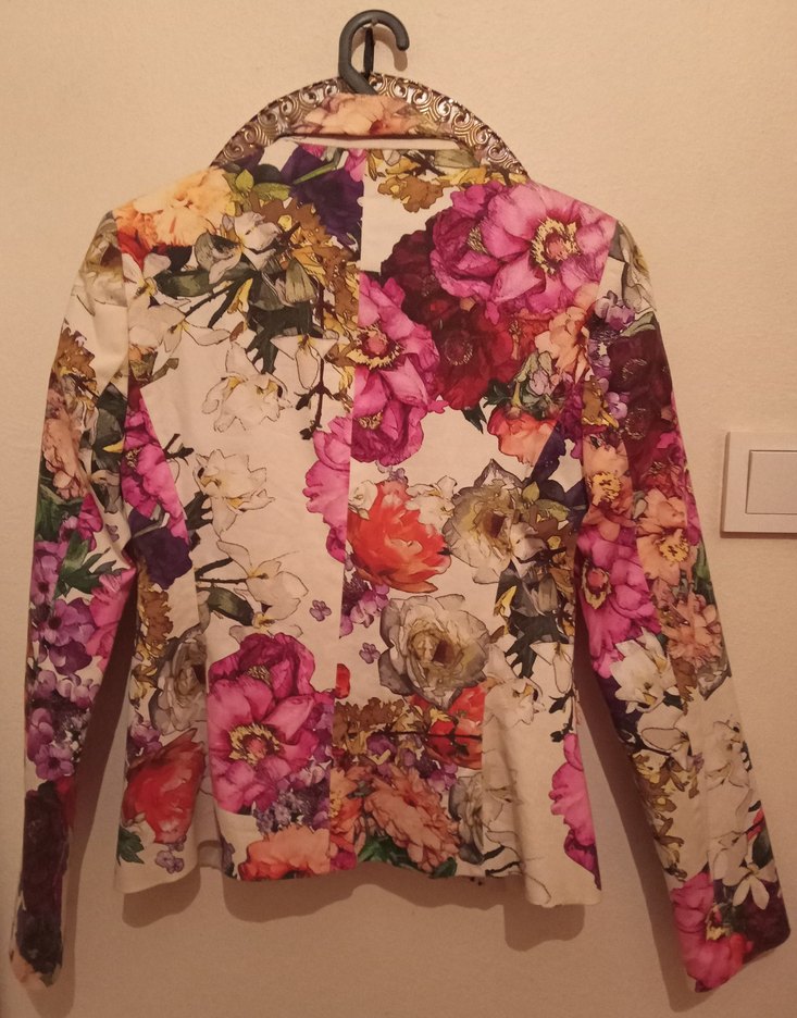 Çiçek desenli, düğmeli, uzun kollu ve normal boyda sentetik kumaştan yapılmış, bohem stilde dar kesim kadın blazer.