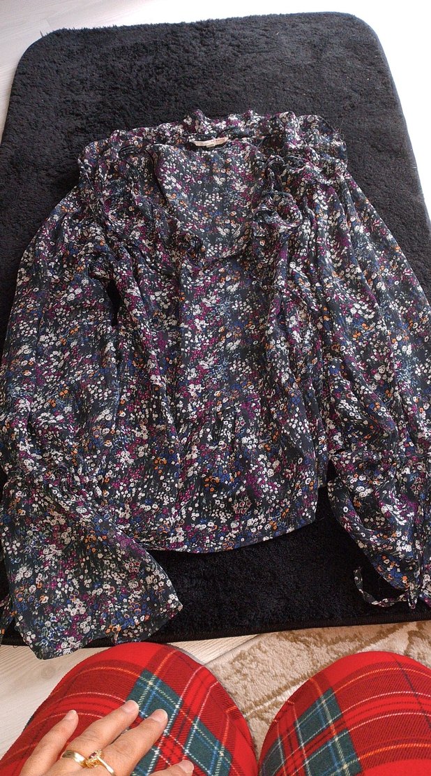 Koyu renkli, çok renkli çiçek desenli kadın bluz, bol kesim, uzun kollu ve yakalıdır. Sentetik kumaştan üretilmiş, düğmeli ve bohem tarzı günlük kullanıma uygundur.