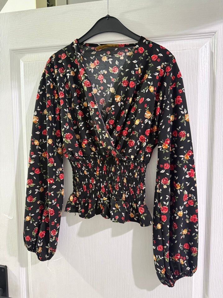 Uzun kollu, V yaka, koyu zemin üzerinde çiçek desenli, bol kesim ve fırfırlı kısa boy bohem kadın bluz.
