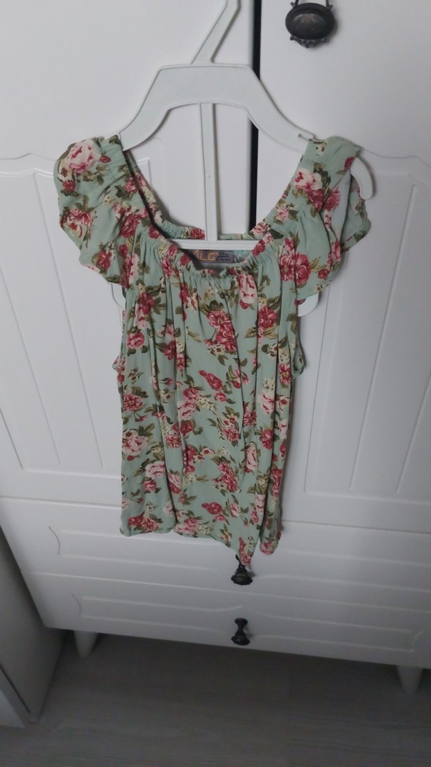 Bu bol kesim kadın bluz, kısa fırfırlı kollara ve askısız yakaya sahip olup, yumuşak sentetik kumaş üzerinde pastel çiçek deseni taşıyor. Vintage bohem tarz için uygun.