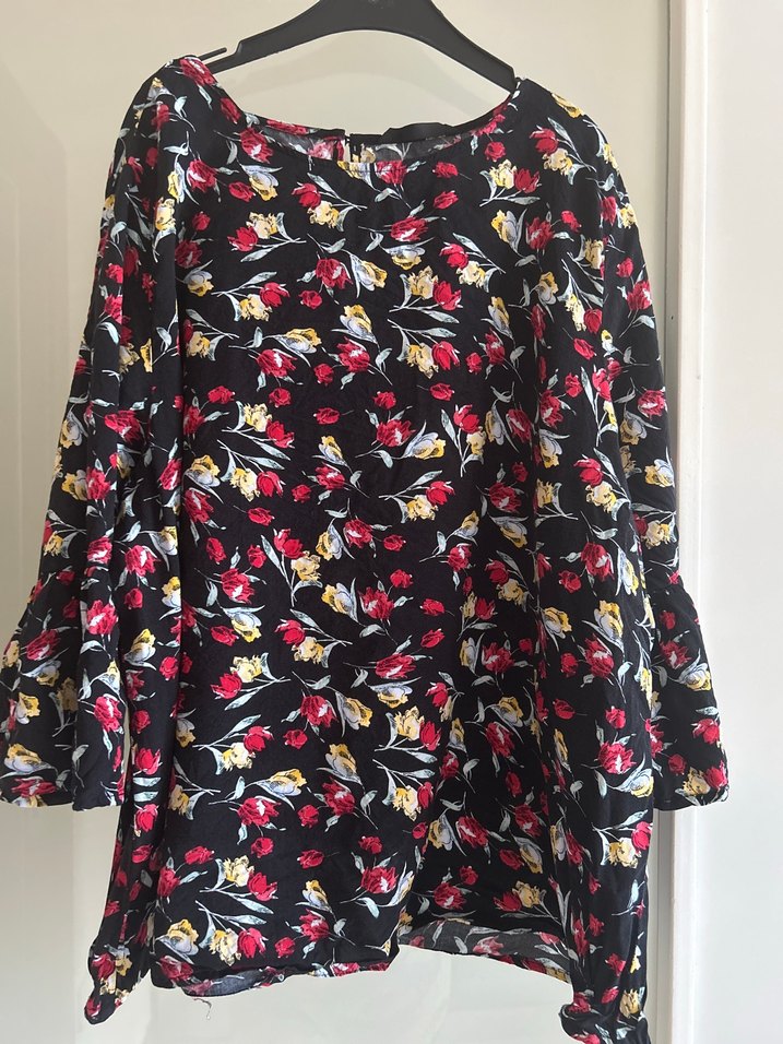 Uzun kollu, fırfır detaylı bol kesim bluz. Koyu renkli çiçek desenli, V yaka ve sentetik kumaştan yapılmıştır. Günlük kullanım için uygundur. Xxl beden giyme sorunu yoktur daha patlatmak için satıyorum fiyatı o yüzden uygun