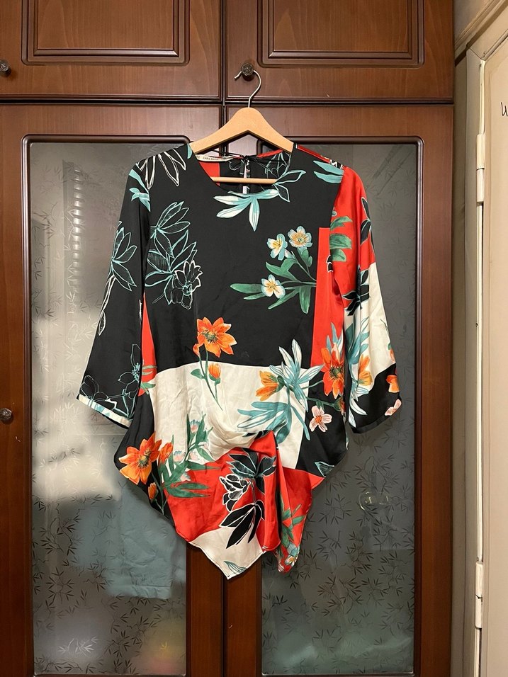Kadınlar için bol kesim, uzun kollu, straplez yaka bluz . Sentetik kumaş üzerinde koyu, çok renkli çiçek desenleri ve drapeli tasarım ile günlük kullanım için uygun. İki koltuk altı arası eni 48 cm boy önden 64 cm arkadan 60 cm