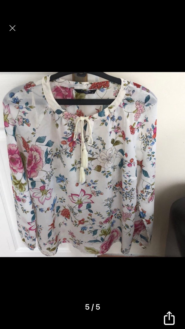 Rahat kesim, uzun kollu ve yuvarlak yakalı, çok renkli çiçek desenli, düğmeli hafif kumaştan günlük kullanıma uygun bluz. Uzunluk omuzdan 79 cm