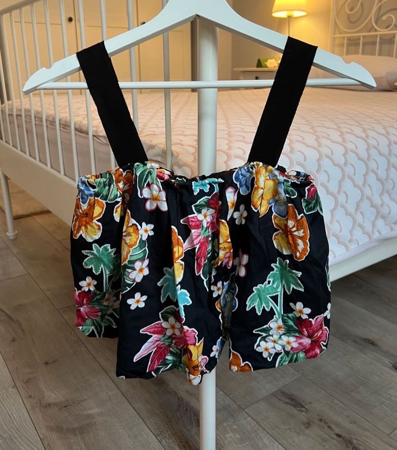 Kadın bluz koyu renkli çok renkli çiçek desenli tekstil, fırfır detaylı ve geniş askılı, bohem tarzda, günlük kullanıma uygun.