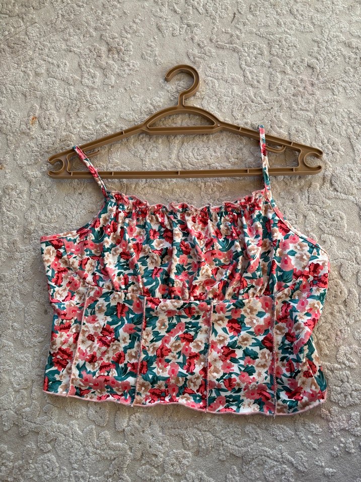 Bohem tarzda, askılı, fırfırlı ve pastel tonlarda çok renkli çiçek desenli kadın büstiyer. Yumuşak kumaştan, rahat kesim, günlük kullanım için uygundur.