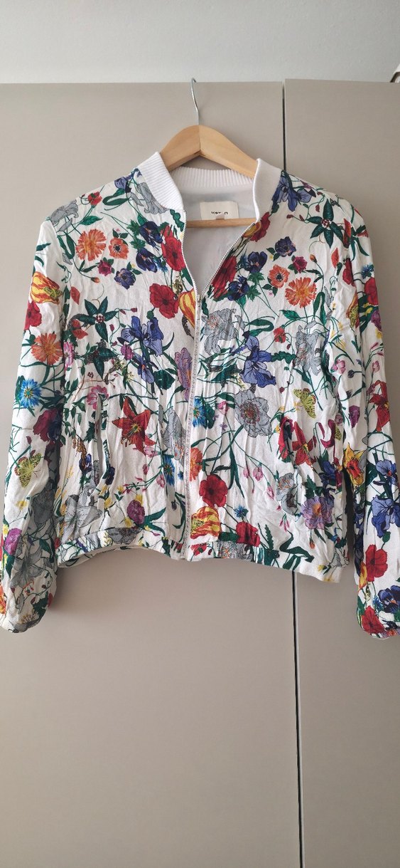 Yumuşak dokulu, çiçek desenli, yüksek yakalı ve düğmeli bol kesim kadın ceket. Bohem tarzı için uygun. İki koltuk arası en 52 cm Omuzdan boy 53 cm Az kullanıldı, defosu yok M -L uyumlu