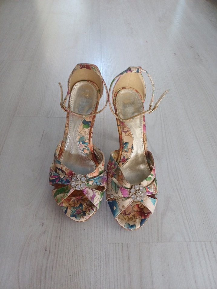 Sentetik kumaştan yapılmış, çiçek desenli pastel renklerde, tokalı kayışlı bohem tarzı dolgu topuklu ayakkabılar. Düğünler ve vintage görünüm için uygundur.