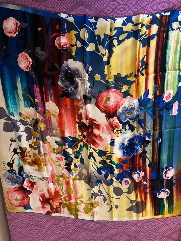 Kadınlar için koyu ve canlı renklerde çiçek desenli, yumuşak sentetik kumaştan bohem tarzda drape edilmiş fular. %100 ipek