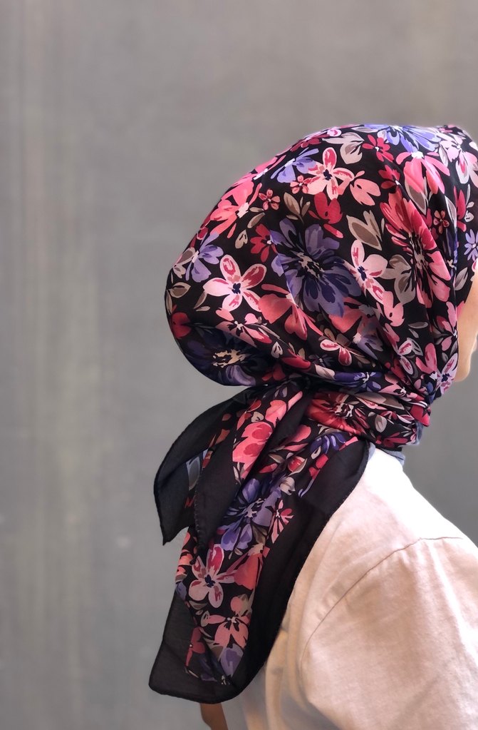 Koyu renkli çok renkli, çiçek desenli, drapeli kadın eşarp. Yumuşak sentetik kumaştan, bohem ve retro tarzlar için uygun.