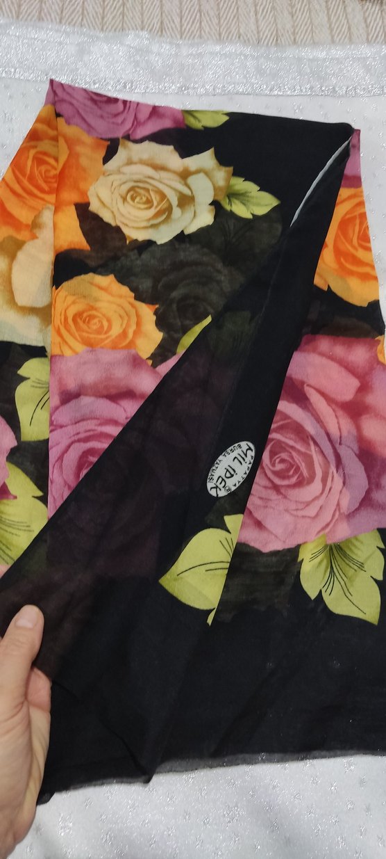 Kadın fular, koyu renkli çok renkli çiçek desenli ve fırfır detaylıdır. Sentetik kumaştan yapılmıştır, bohem ve retro tarzlarına uygundur.