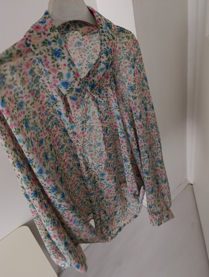 Yumuşak sentetik kumaştan, düğmeli, uzun kollu, yakalı, pastel çok renkli çiçek desenli, bol kesim kadın gömlek.
