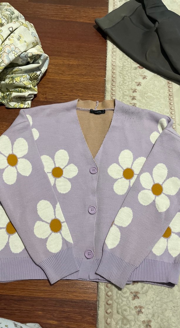 Pastel mor renkli, çiçek desenli ve V yakalı örme hırka. Uzun kollu, bol kesim ve düğmeli, rahat ve bohem tarz için uygun.
