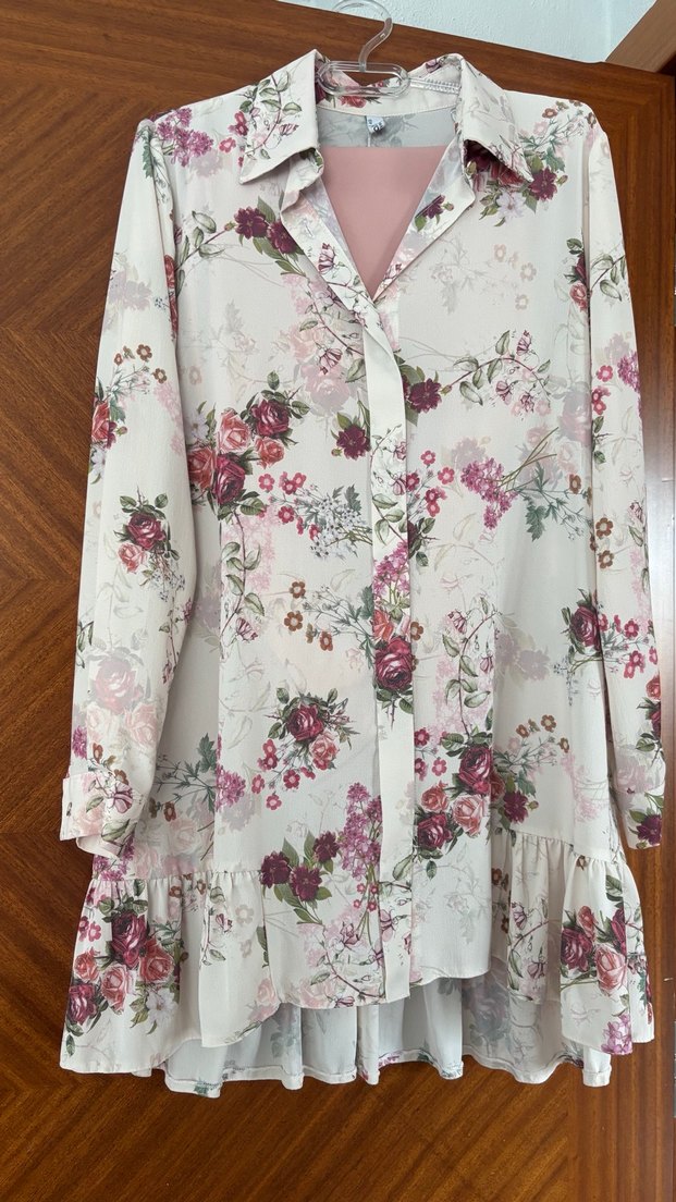 Uzun kesim, bej renkli, pastel çiçek desenli, uzun kollu, V yakalı, düğmeli, bol kesim kadın tunik. Pudra pembe pantolonuyla birlikte gönderilecektir.