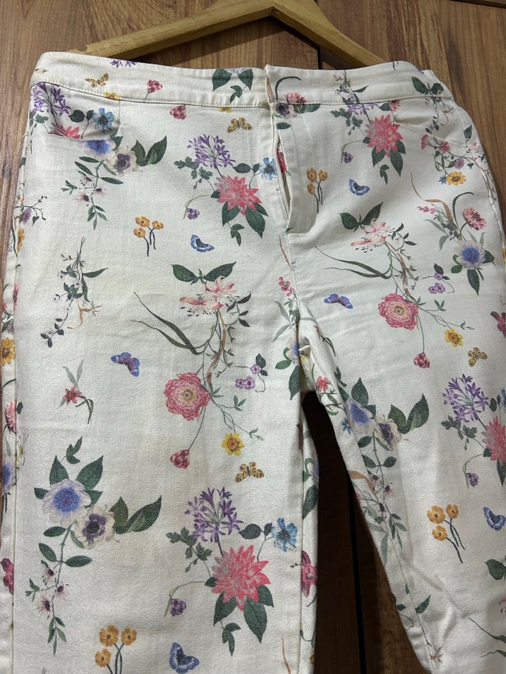 Beyaz sentetik kumaştan, pastel çiçek desenli, düğmeli, bol kesim bohem tarzı kadın kumaş pantolon, midi boy, günlük kullanım için uygundur.