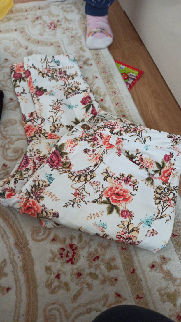 Çiçek desenli, dantel detaylı uzun kumaş pantolon. Pastel renklerde, rahat kesim ve ev kullanımı için uygundur.