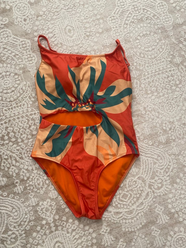 İnce askılı, çiçek desenli ve dantel görünümlü kesim detayıyla renkli, bohem tarzda kadın mayo, plaj için uygundur.
