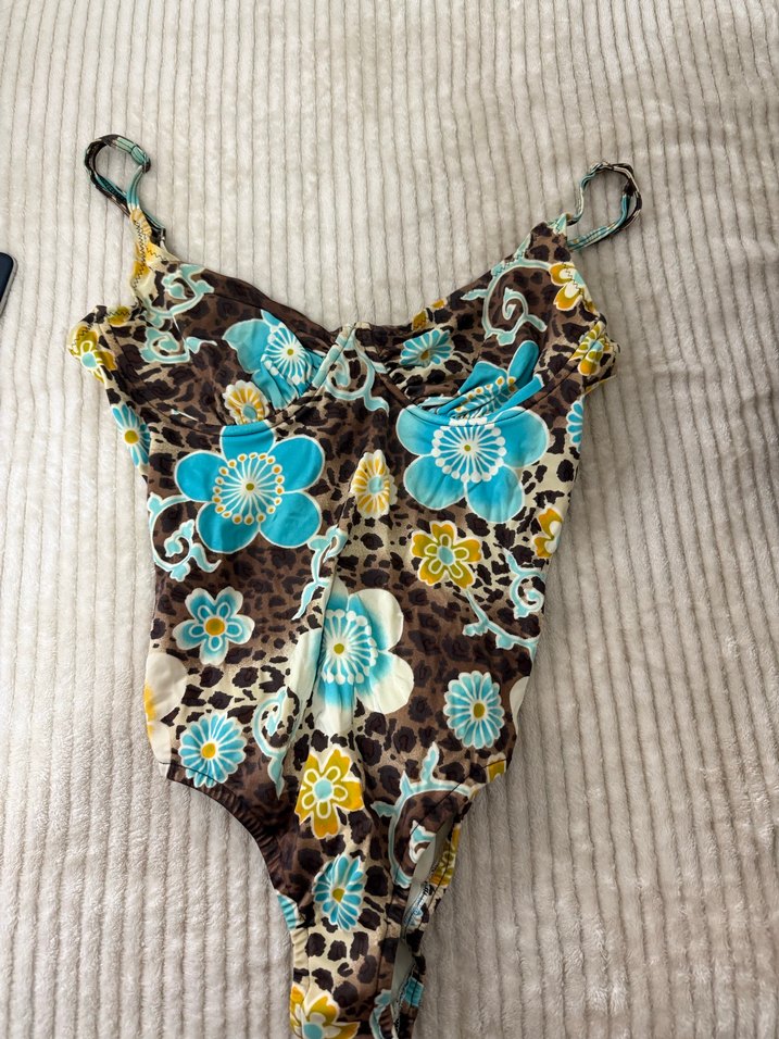 Çiçek desenli, bağcıklı askılı ve dantel detaylı bohem tarzda, vücuda oturan kadın mayo. Plaj için uygundur. ️