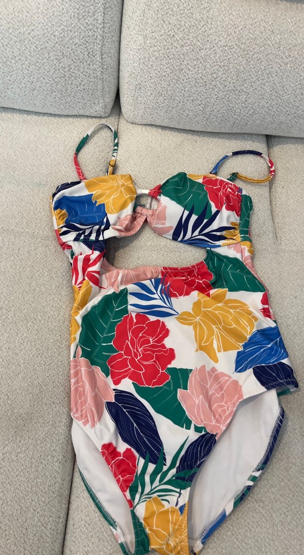Renkli çiçek desenli, ince askılı ve fırfırlı detaylı, bohem tarzda kadın mayo.