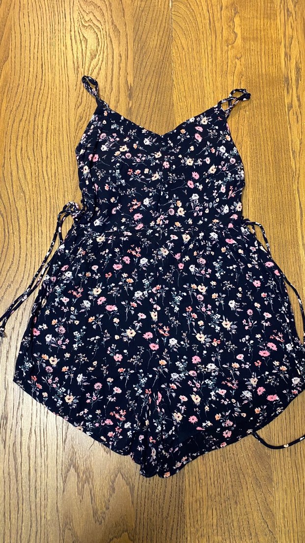Kadınlar için askılı, straplez yaka ve dantel detaylı, bol kesim mini tulum. Sentetik kumaştan, koyu renkli çok renkli çiçek desenlidir. Romantik akşamlar için uygundur.