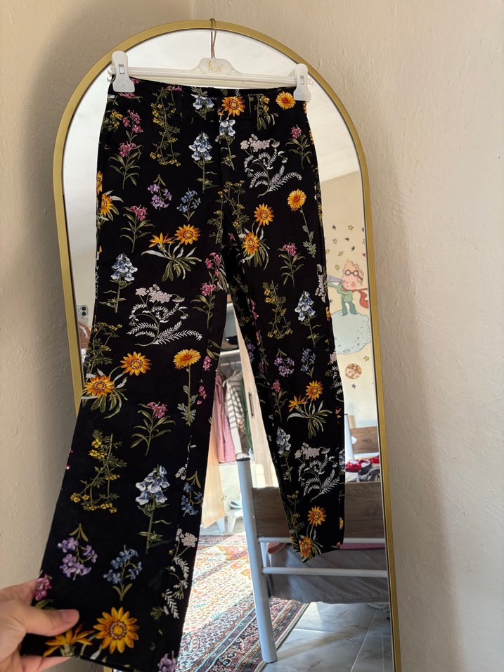 Çiçek desenli, koyu renkli, bol kesim, midi boy kadın pantolon. Bohem sokak tarzına uygun, günlük kullanım için rahat bir model.