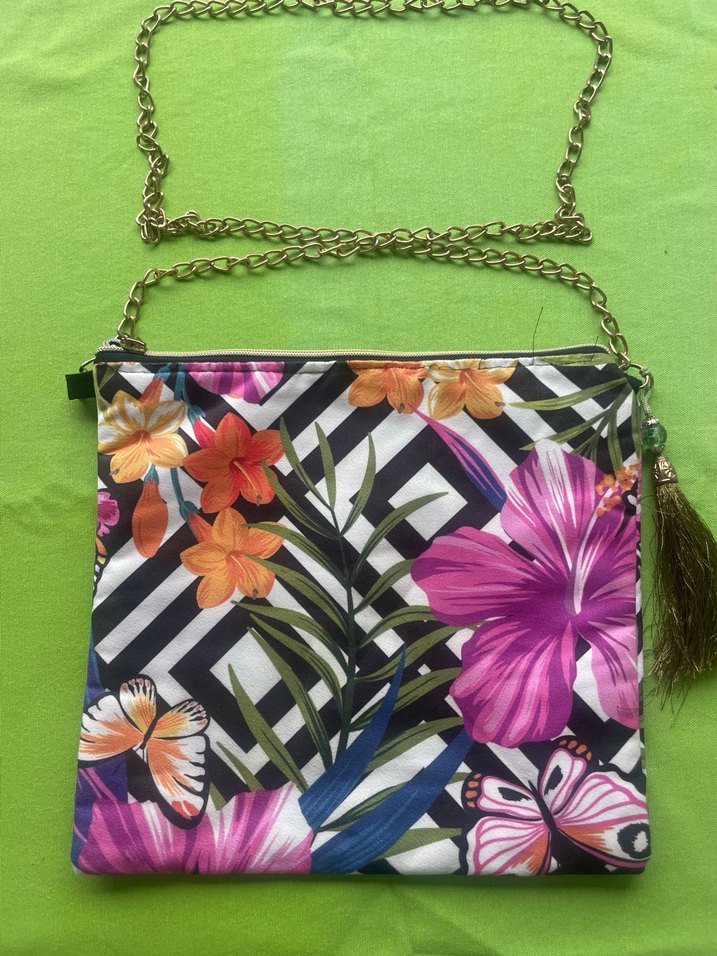 Çiçek desenli, sentetik kumaştan yapılmış, püskül detaylı ve zincir askılı renkli bohem plaj çantasıdır. Günlük kullanıma uygundur.