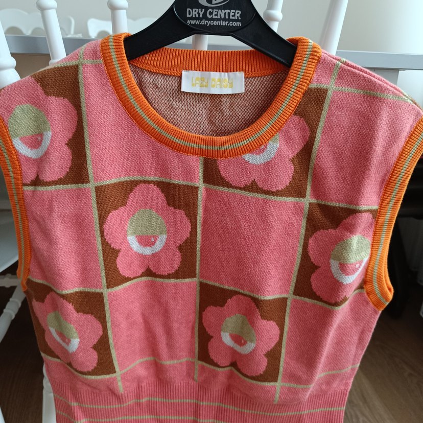 Pastel pembe renkli, çiçek desenli, yuvarlak yaka, kolsuz, bol kesim, midi boy kadın yun süveter. Rahat ve bohem tarzda. 38 bedenden 42 bedene dek olur