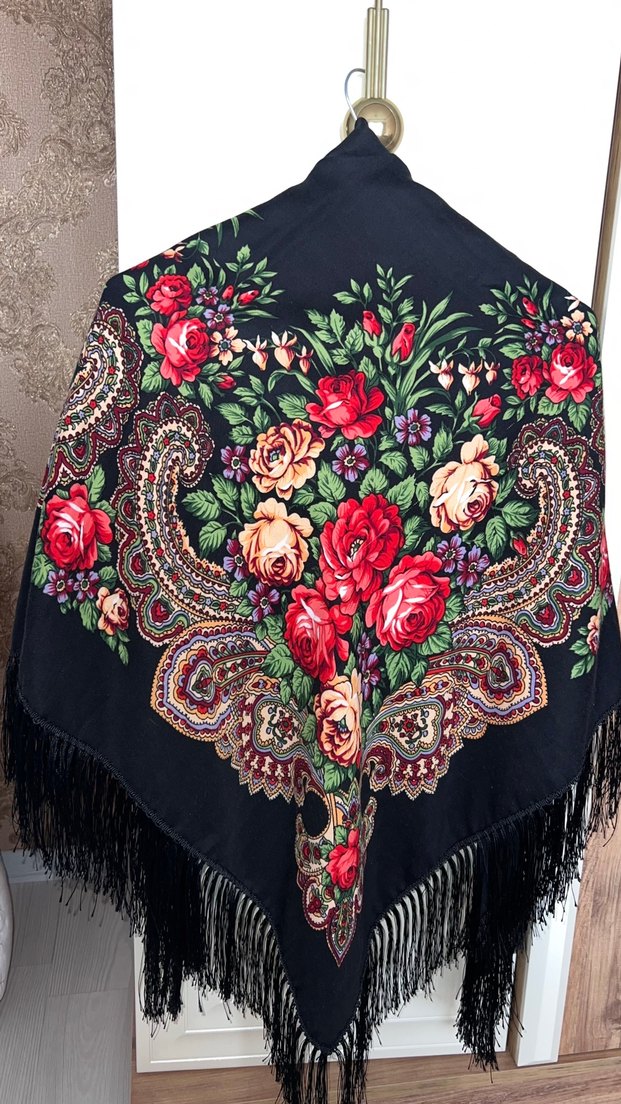 Kadınlar için çiçek desenli, koyu renkli çok renkli, yün kumaştan, dökümlü bohem tarzda şal.