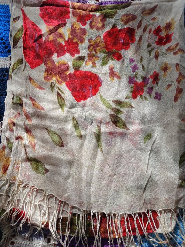 Çiçek desenli, çok renkli ve gri tonlarda, bohem tarzda kadın şalı. Uçları püsküllü, dokusu tekstil ve salaş duruyor. Boy 176 cm.