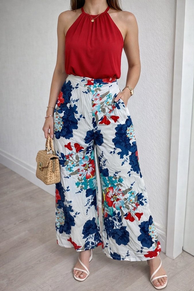 Rahat kesim, çiçek desenli ve dökümlü kumaştan yapılmış uzun bohem kadın pantolonu, günlük kullanım için uygun.