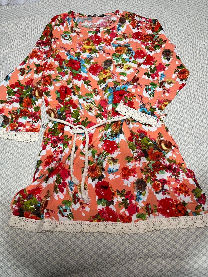 Renkli bohem kadın tunik, bol kesim, uzun kollu ve canlı çiçek desenlerine sahiptir. Belinde kuşak ve manşet ile etek ucunda dantel detayları bulunur. Ürün butik ürünüdür. Hiç giyilmedi.