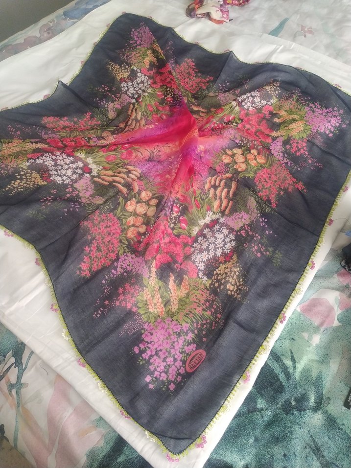 Kadın fular, koyu renkli çoklu çiçek desenleriyle bohem ve retro tarzda, dokuma kumaştan yazma